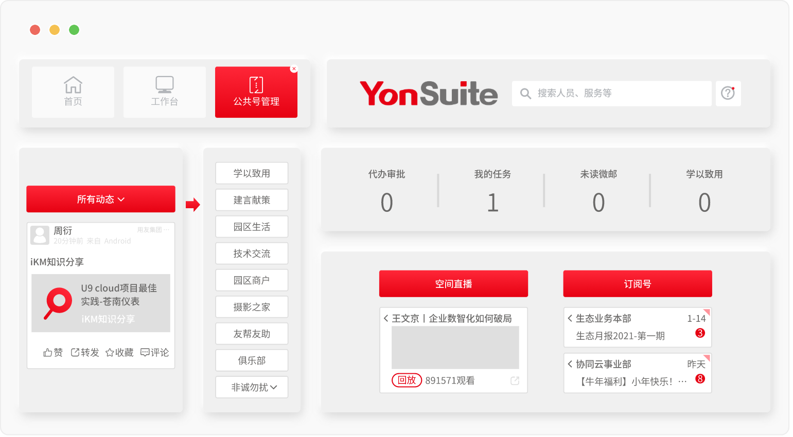 YonSuite協同服務為企業打造web企業信息門戶,為員工提供移動工作臺,實現經營業務快速線上開展,和企業全員移動辦公。以移動化服務為基礎、覆蓋工作全場景,人人互聯、事事互通,為企業構建一站式數字工作臺。