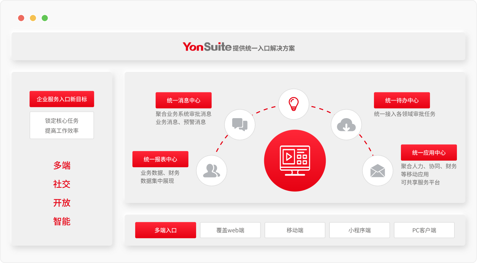 企業可通過YonSuite協同服務構建企業內部資源管理系統的第一窗口,打造集團管控統一入口,解決企業"信息孤島",實現高效辦公、共享協作,打造數據決策的"支持入口"。通過移動端,實現應用靈活構建,多種系統數據集成打通,一個app管理所有應用系統,實現內部經營管理一體化。