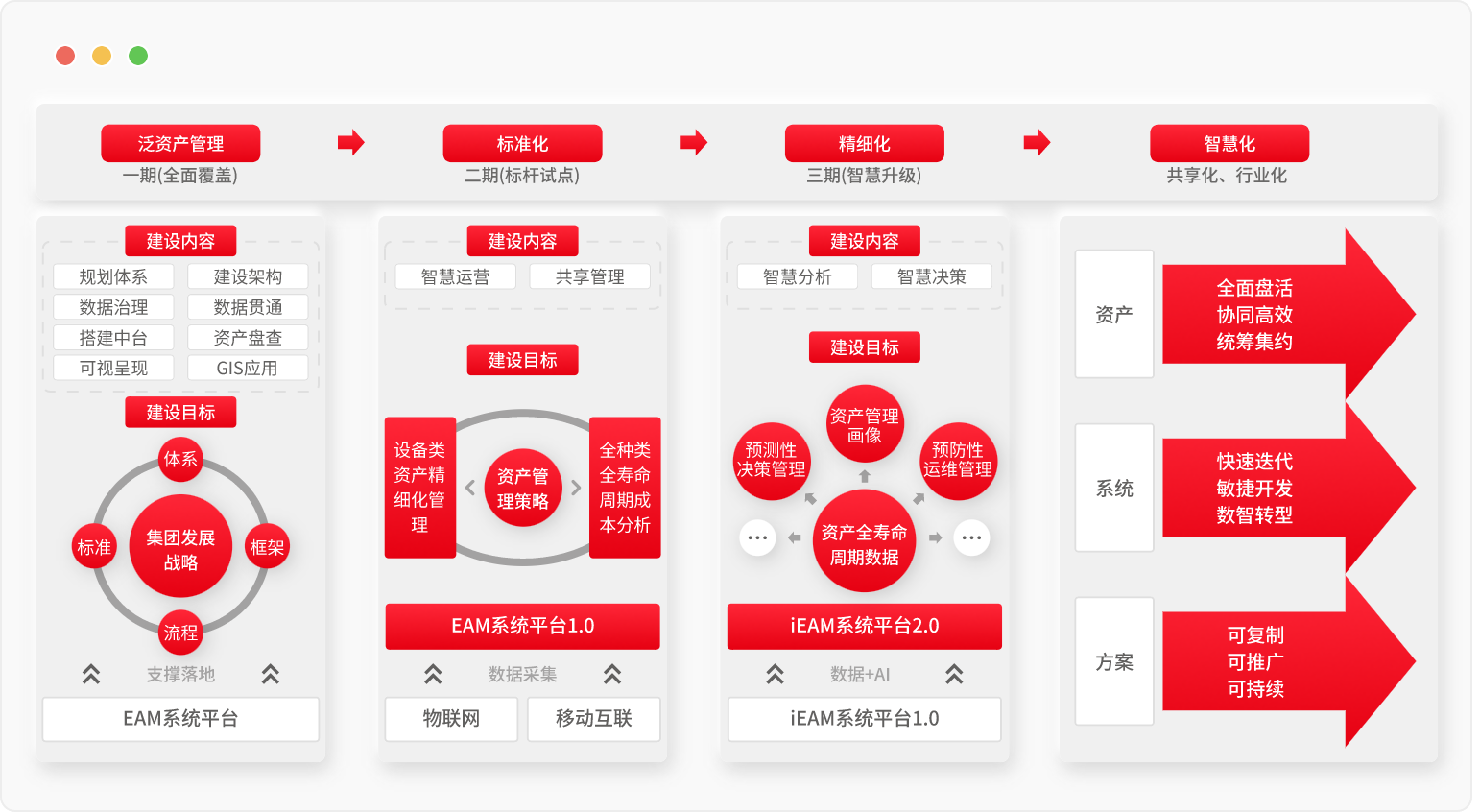 幫助企業(yè)統(tǒng)一和規(guī)范資產(chǎn)管理的制度、流程 幫助企業(yè)建立統(tǒng)一完備的資產(chǎn)臺(tái)賬 幫助企業(yè)建立統(tǒng)一標(biāo)準(zhǔn)的維修維護(hù)作業(yè)規(guī)程、維修定額